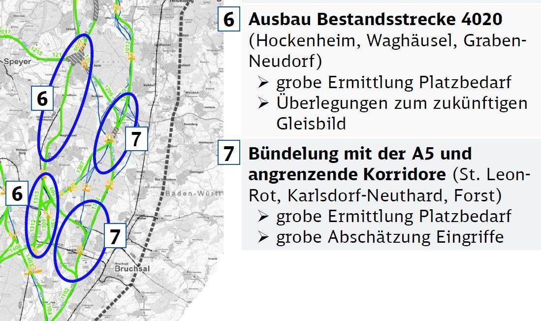 Von Karlsruhe kommend sollen zwei weitere Gleise entlang der A5 nach Norden führen, den Engpass Karlsdorf-Bruchsal als Tunnel passieren und dann bei Forst parallel zur Schnellbahnstrecke verlaufen. Über Waghäusel, Hockenheim und Schwetzingen geht es dann in Richtung Mannheim. Der genau Verlauf bei Mannheim wird mit den Zugzahlen 2040 festgelegt.