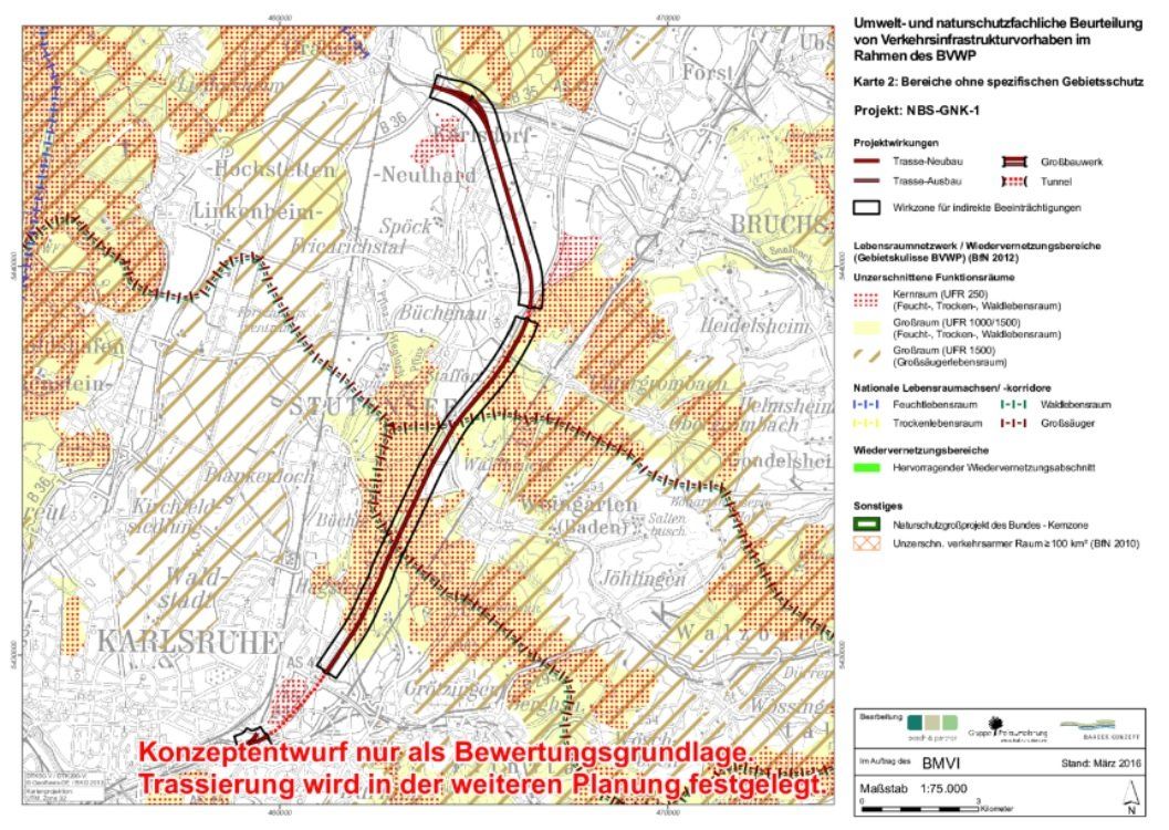 - es wurden bereits vor der Erstellung des finalen Verkehrswegeplanes 2030 umfangreiche Alternativen geprüft, wie z.B. eine Trassenführung parallel zur bestehenden (Stutensee hatte sich massiv dagegen gewehrt) oder Trassenführungen jenseits des Rheins (wurden auch abgelehnt)