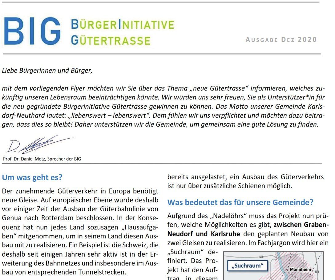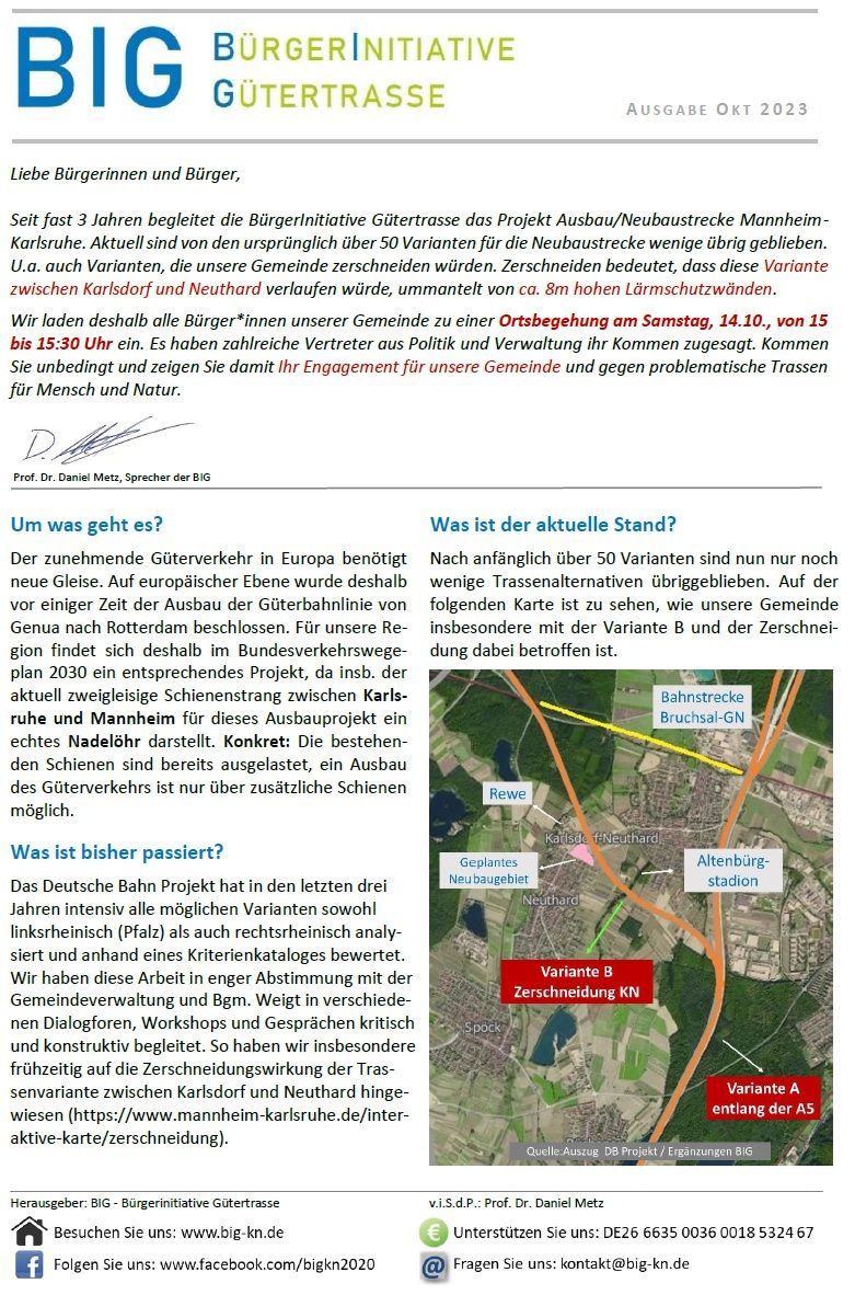 Am Sonntag, den 23.02.2025, ist Bundestagswahl. Unser Sprecher Prof. Dr. Daniel Metz hat im Namen der BIG (BürgerInitiative Gütertrasse) die Bundestagskandidat:innen von CDU, SPD, Grüne, FDP, die Linke und AfD der Wahlkreise Bruchsal-Schwetzingen, Karlsruhe-Land und Karlsruhe-Stadt angeschrieben und Fragen zur Realisierung des Bahnprojektes Mannheim-Karlsruhe gestellt. Schließlich sind die Wahlkreise direkt betroffen und eine Entscheidung wird in der kommenden Legislaturperiode fallen.